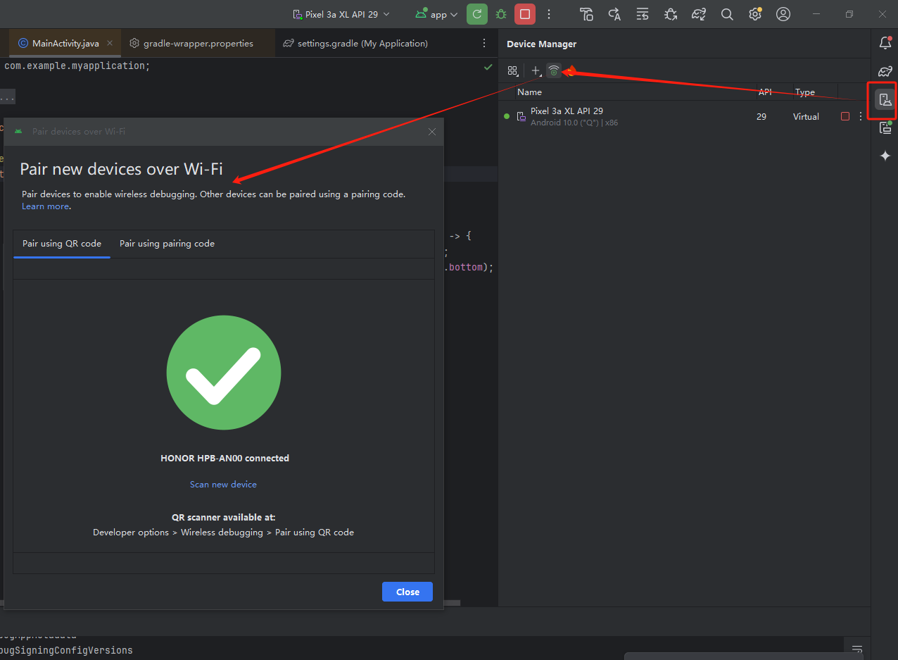 返回设置->系统和更新->开发者选项->无线调试(确保手机和电脑在同一局域网内)->打开无线调试
