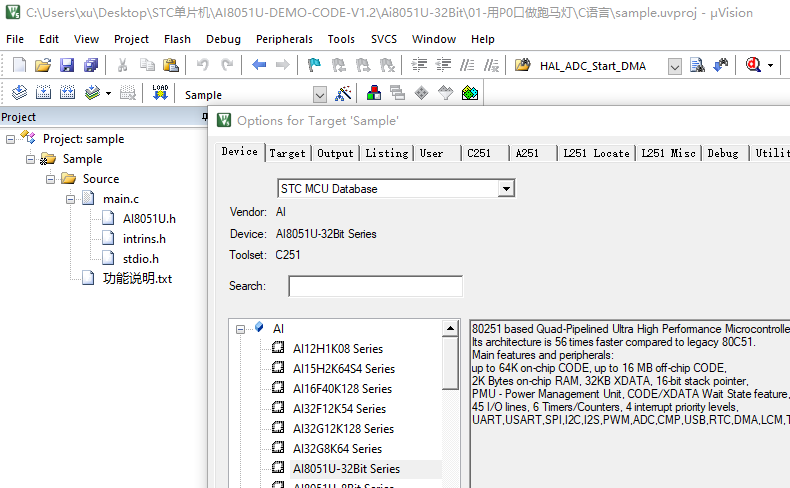 改用Ai8051U-32bit的芯片编译后debug仍报同样的错误。