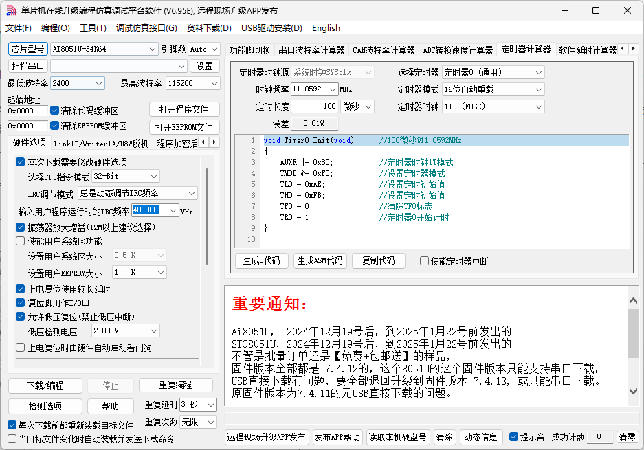 ①:在下载软件中选择“定时器计算器”功能页,进定时器代码生成界面