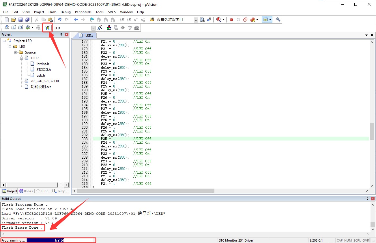 看到您使用的是32G12K128,以一箭双雕仿真屠龙刀例程01-跑马灯为例