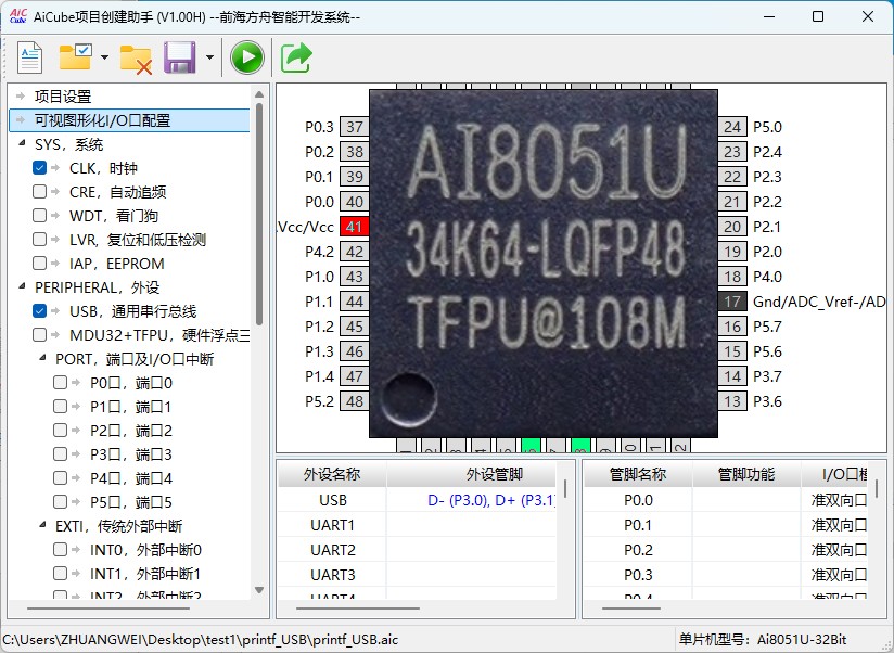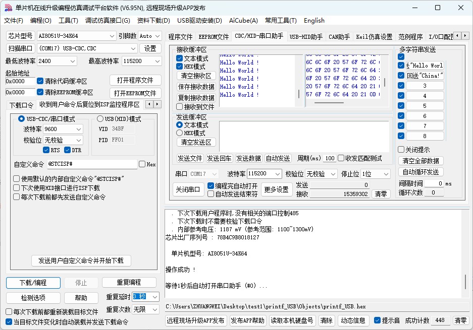 连接AI8051U实验箱,按住P32按键不放,按下Power键后松开,再松开P32按键,进入USB下载模式。在AiCube中打开生成的Hex文件,点击“下载”按钮,将程序烧录到实验箱中。下载完成后,打开CDC/HID-串口助手,可看到串口持续输出“Hello World !”信息。
