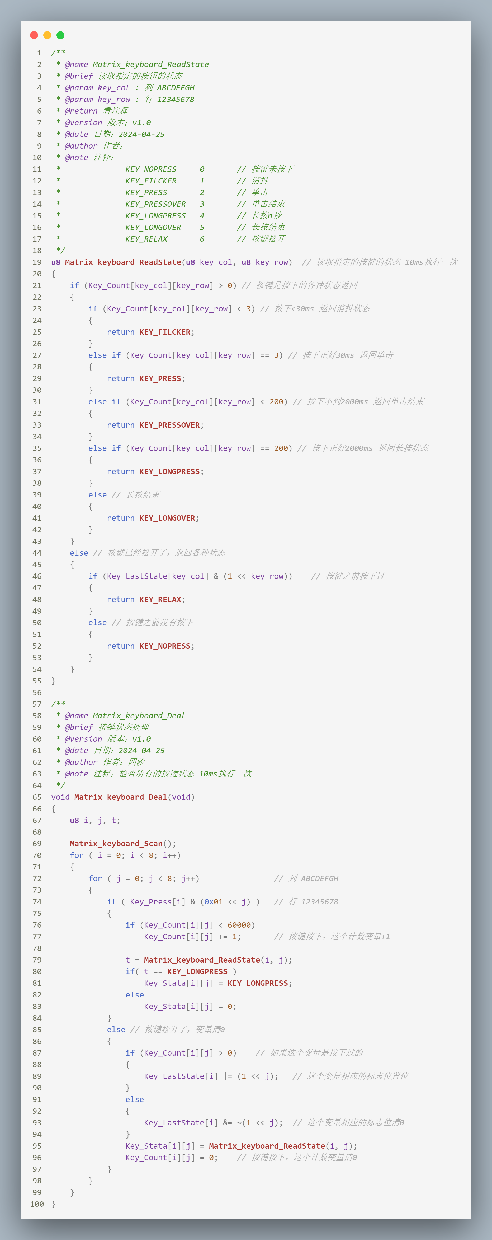 消抖处理:按键在按下和释放时可能会产生抖动,需要通过软件消抖算法来消除抖动影响。