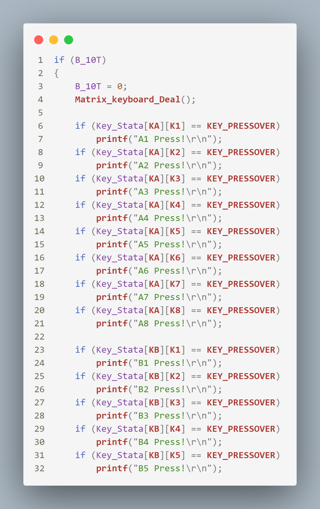 这里以10ms作为扫描时基,如果A1为单击操作则打印“A1 Press!”,其他按键同理。