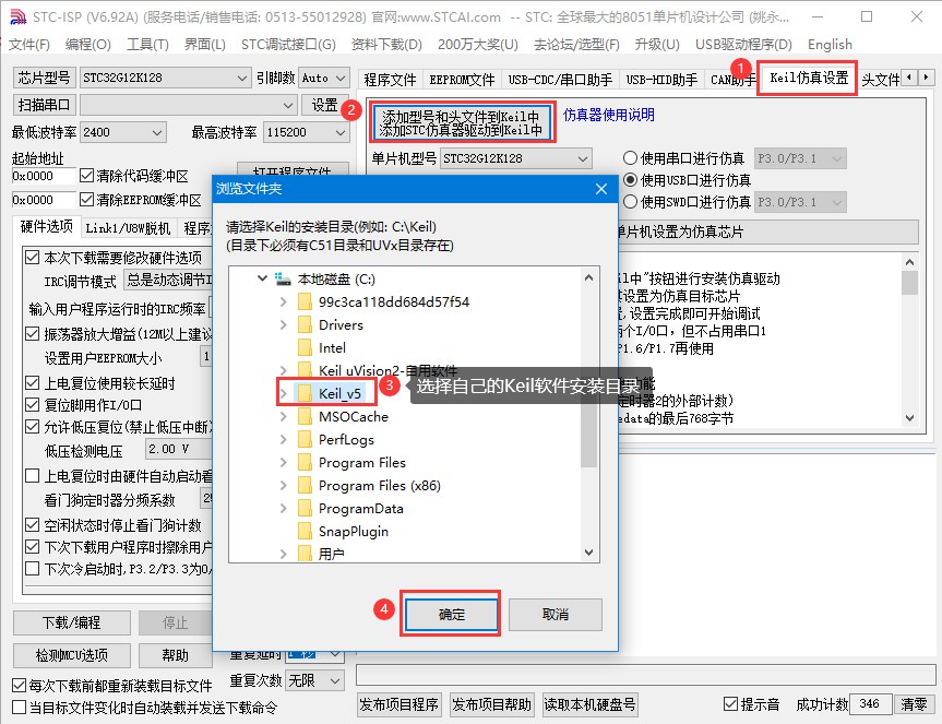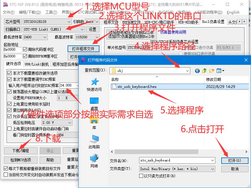 2.将LINK1D链接电脑,然后添加仿真器的固件和芯片型号到KEIL 3.建议手动更新一下固件,此时切记仿真器不要连接我们的单片机!!(注意下这里的设置主控和清除数据两个步骤的操作顺序)