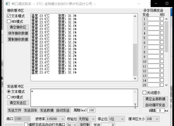 提前预告一波今天实现的功能如下所示,可以在串口助手里间隔0.5秒左右打印一次当前的温度和湿度: