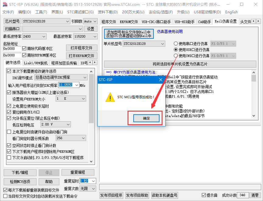 (设置成仿真芯片后STC-ISP软件会自动出现这个提示)。
