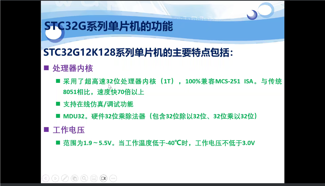 内部数据RAM存储器,卡片扩展RAM。 外部数据存储器-外部数据存储器访问控制 STC15系列40引脚以上的单片机具有扩展64KB外部数据存储器和I/O口的能力。 STC32系列单片机处理器核兼容MCS-251 ISA,真正实现了1位/8位/16位和32位的操作。