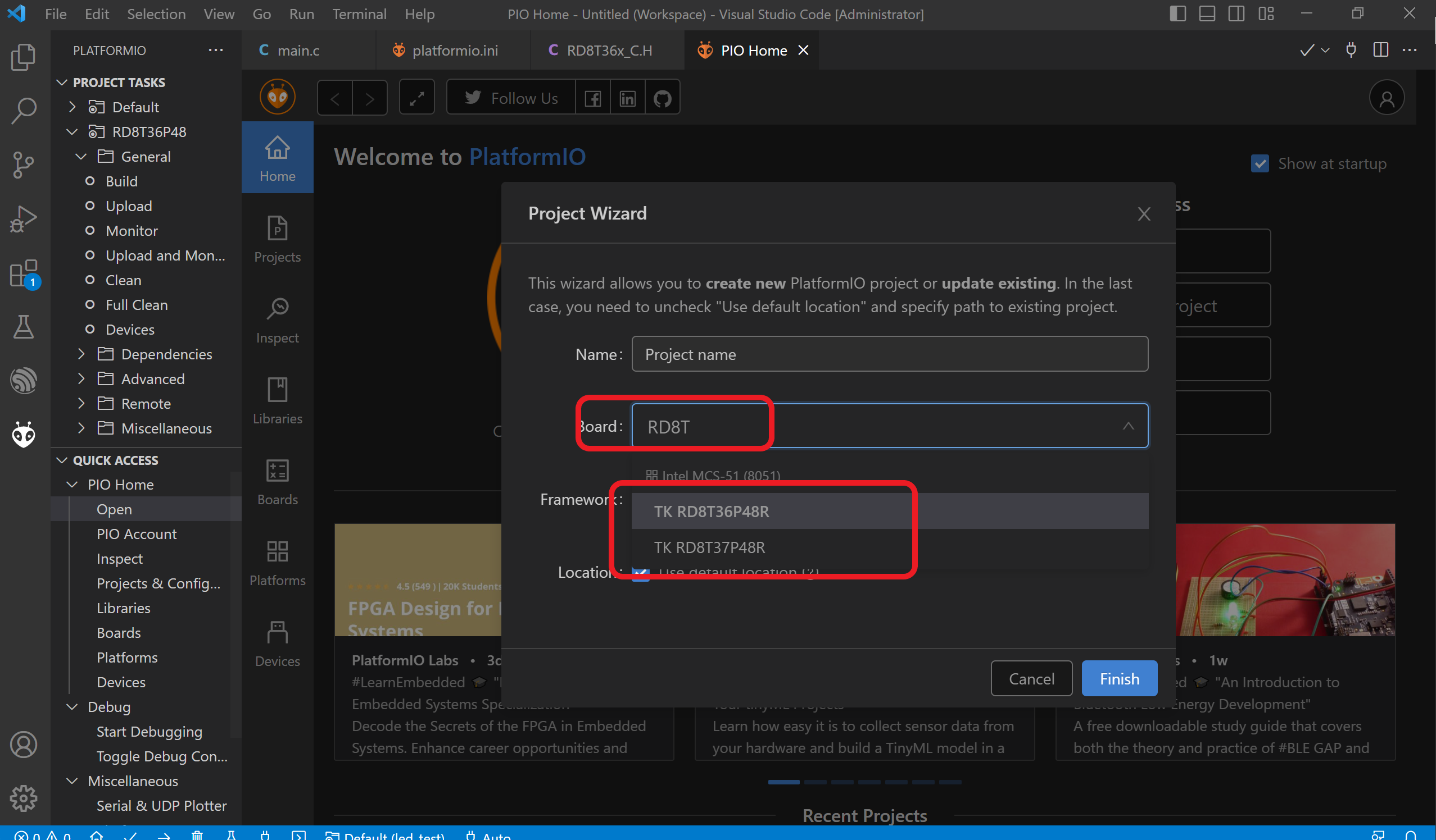 只需要按照上边的结构在存放配置的目录下(C:\Users\Administrator\.platformio\platforms\intel_mcs51\boards 注意前边的内容改成pio的安装目录)新建一个XXXXX_IC.json 文件即可。比如我有一颗RD8T37P48。 就在这个目录下新建 RD8T37P48.json, 内容如下: