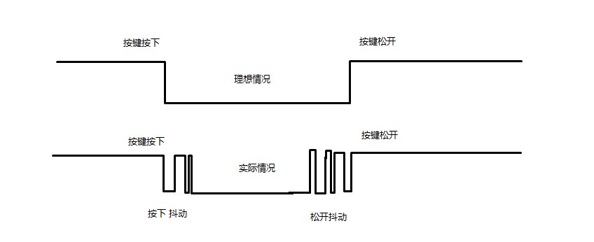三、用户程序编写 1.按键检测函数 总有好多小伙伴问这个按键消抖怎么写,这里就简单的提供一种思路 这里所谓的抖动就是如上图那样,没按下的时候是高电平,按下之后马上变低电平,当然这是理想状态,实际因为机械按键会存在抖动的现象, 他会高低电平有一段变化的区间,常规的消抖就是检测到低电平了延时10ms在判断,当然这种相对来说并不可靠,我常用的思路就是,间隔1ms,连续10次检测到低电平即为触发了。即可通过如下代码实现: - u8 KEY_Read(u8 no)