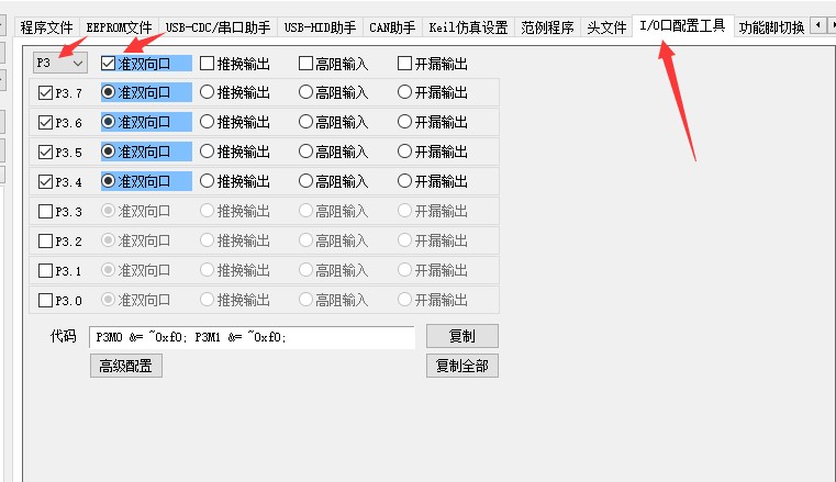 二、驱动函数编写 这时候我们就可以使用我们的ISP软件来配置IO了(切记一定要使用最新的ISP软件!!一定要使用最新的ISP软件!!一定要使用最新的ISP软件!!) 1.LED输出引脚初始化(推挽输出)
