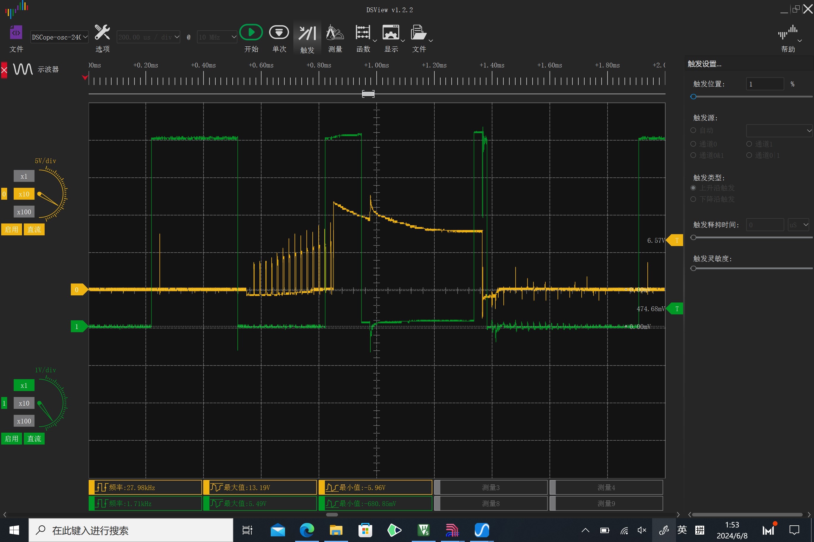 最近用STC8H1K17T做了一无刷电调。需要用到PLL + PWM来实现高频率、高于10位分辨率的互补PWM波。接通电机后,发现电机转动过程中随机出现“抖动”。用示波器抓波形,发现如下现象: