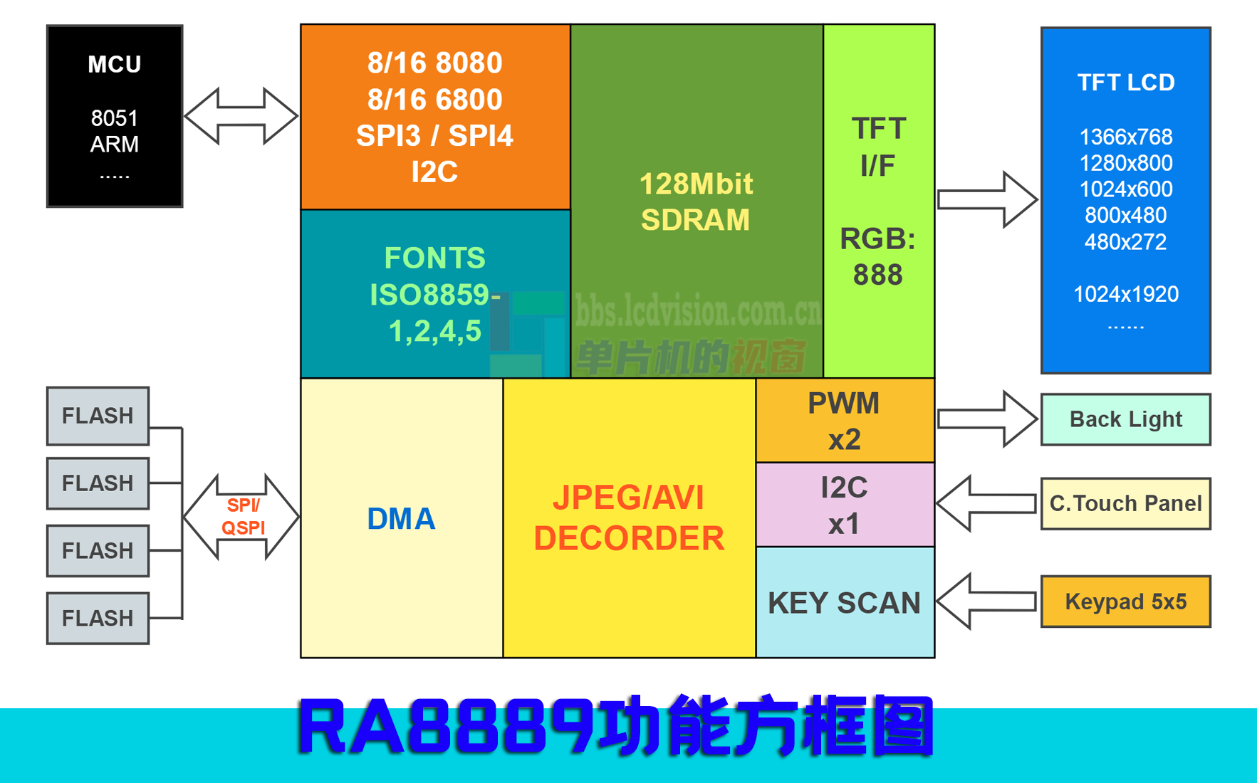 RA8889是一款瑞佑科技推出的高性能液晶控制芯片,单片机下指令即可,可以驱动最高1366x768等液晶屏,其内建JEPG解码引擎,图形驱动引擎,因此显示速度相当不错,是单片机扩展彩屏UI的好搭档。也有低阶的型号比如RA8871M,RA8873M等,可根据实际需求选择。RA8889功能方框图: